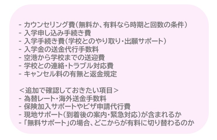 • 費用見積・支払いサポート:授業料・滞在費・保険などの支払い代行